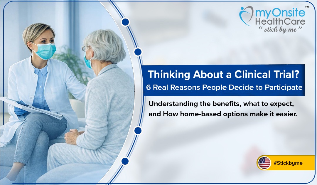 Blogs Thinking About a Clinical Trial? 6 Real Reasons People Decide to Participate Mar 18, 2021 | Blogs Categories AllClinical Research / TrialIndustry NewsmyOnsite NewsMessage from CEOJoin our TeamOthers Quick Links Mobile Phlebotomy ServicesEvent ServicesClinical Research ServicesContact Us